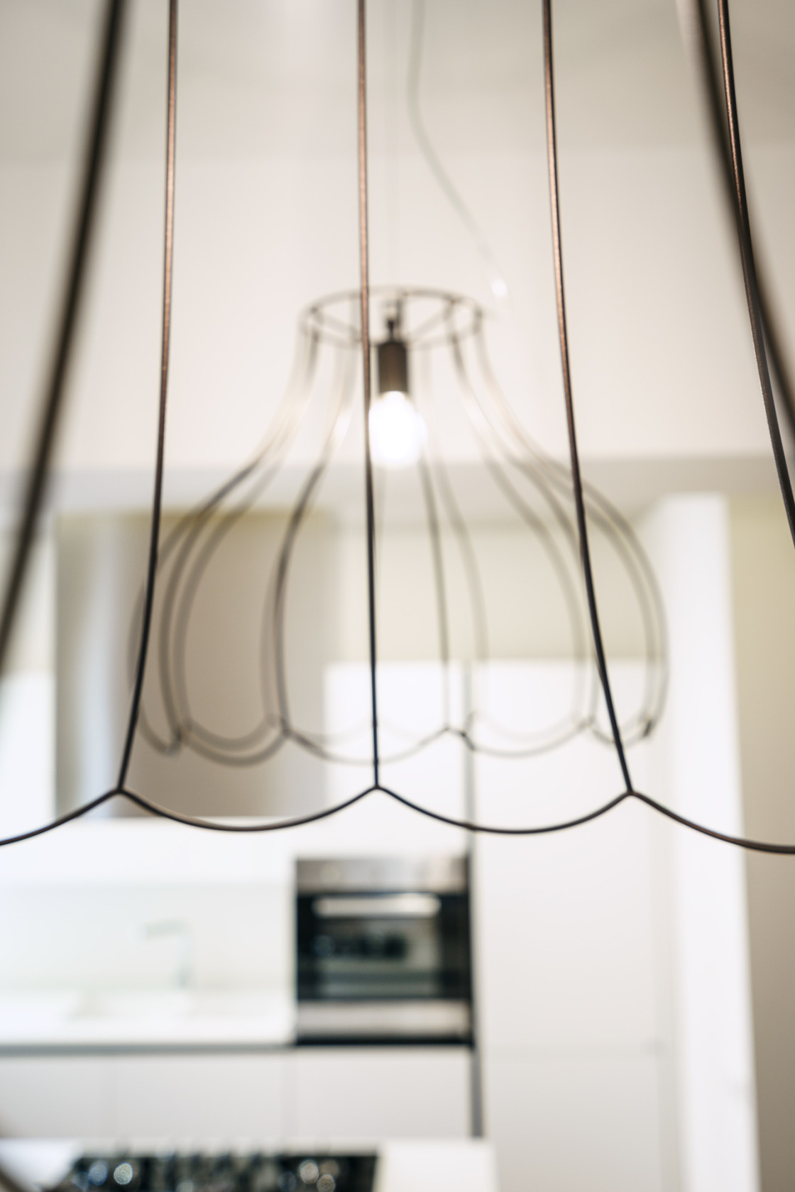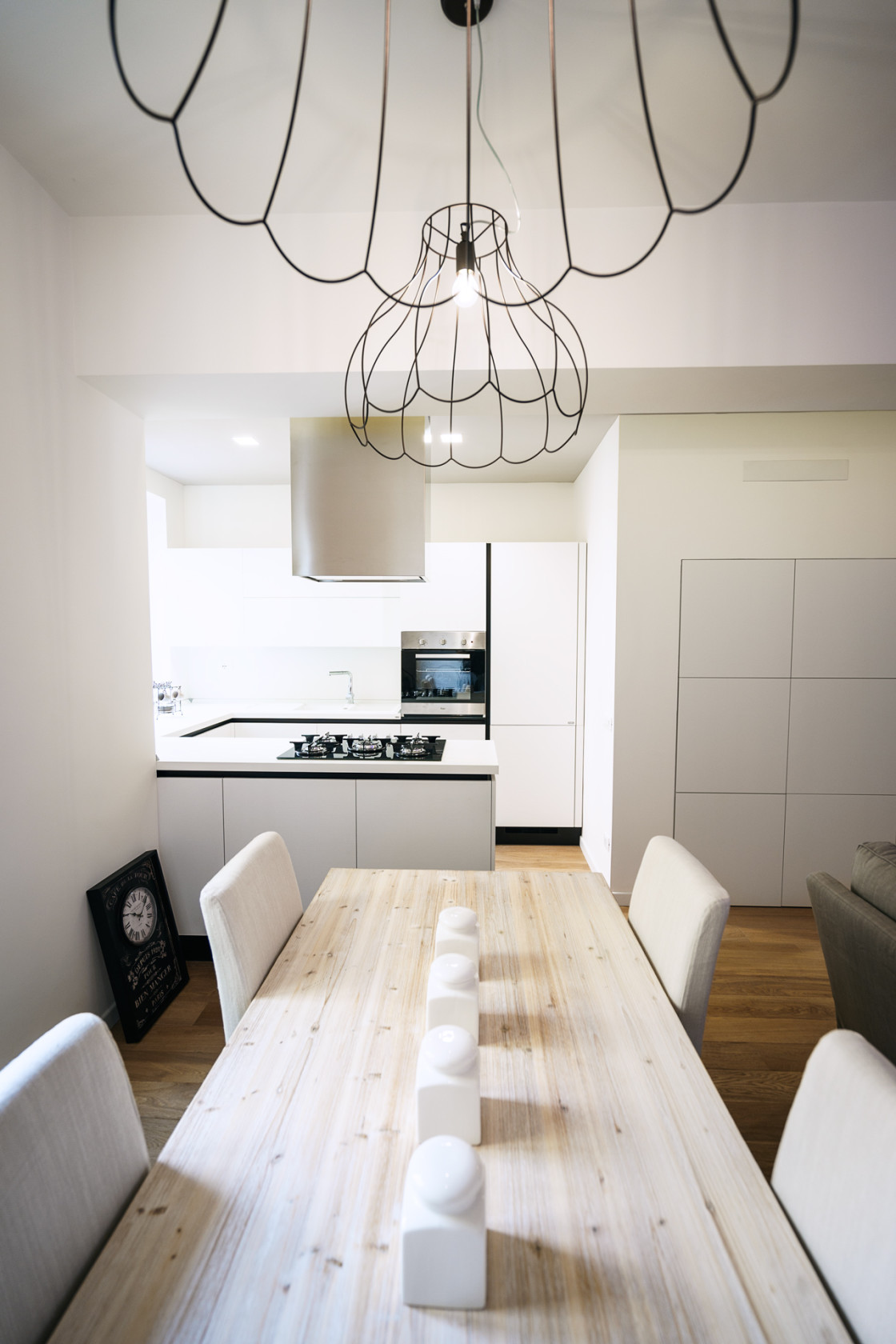 Кухня освещается LED-светильниками, а над обеденным столом размещены двух оригинальные проволочные люстры. Они создают контраст со стоящими на столе керамическими ёмкостями в деревенском стиле.